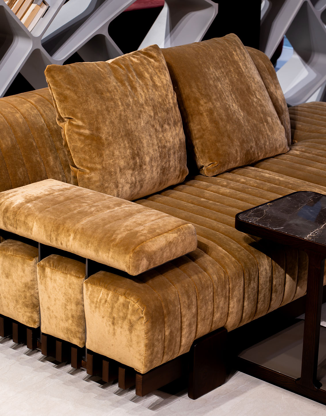 AUTORE — это не просто диван, а модульная система сидений с новой «грамматикой» движения в домашнем пространстве. Жизнь в интерьере становится динамичной: мягкая мебель превращается в многофункциональный элемент, способный естественно адаптироваться к разным моментам повседневной жизни. Сердцем проекта AUTORE является вращающийся механизм, позволяющий форме и конфигурации изменяться плавно и интуитивно. В линейной конфигурации он подходит для совместного просмотра фильмов; в угловой — общению и уединению. При необходимости система трансформируется, компактно складывается и превращается в интегрированное спальное место, выходя за рамки традиционной эстетики дивана-кровати и утверждаясь как гармоничный, элегантный и функциональный элемент интерьера. AUTORE сохраняет элегантность, перекликающуюся с классикой: благородные и уютные пропорции, тщательно продуманные детали и широкие подлокотники позволяют варьировать посадку и эргономику. Обивка с модульной стёжкой формирует выразительную поверхность. Вариант с отделкой из гладкой кожи или ткани предлагает более сдержанный образ, подчёркивая материал и пропорции.