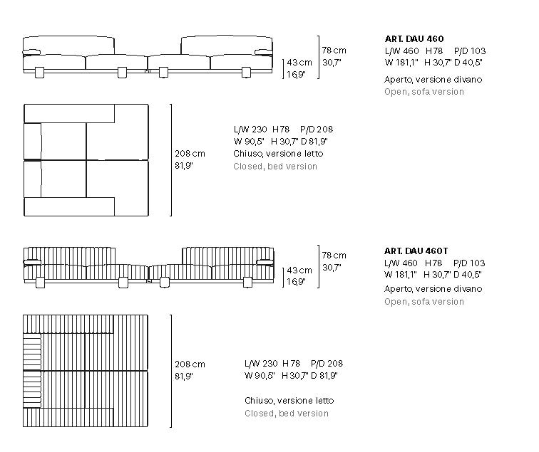 Подушки сидений оснащены системой независимых карманных пружин, интегрированной со слоями полиуретана различной плотности и ватина, что обеспечивает эргономичную, равномерную и долговечную поддержку со временем. Подлокотники имеют металлический каркас с окрашенным покрытием, дополненный подушкой из полиуретана различной плотности. Обивка доступна в коже, ткани или ткани с широкой стёжкой.