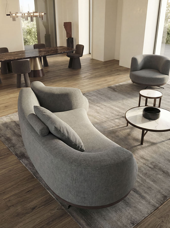 Мягко изогнутая линия спинок усиливает ощущение защиты, заботы и уюта, которое коллекция естественным образом выражает. Оснащённый одним или двумя поворотными терминальными элементами, Bordone Upwood превращается в гибкое пространство, способное адаптироваться к текущему настроению: место для общения или уединённое убежище, мягкий кокон, в котором можно обрести приватность и спокойствие, или же открытая сцена для семейной жизни и общения.