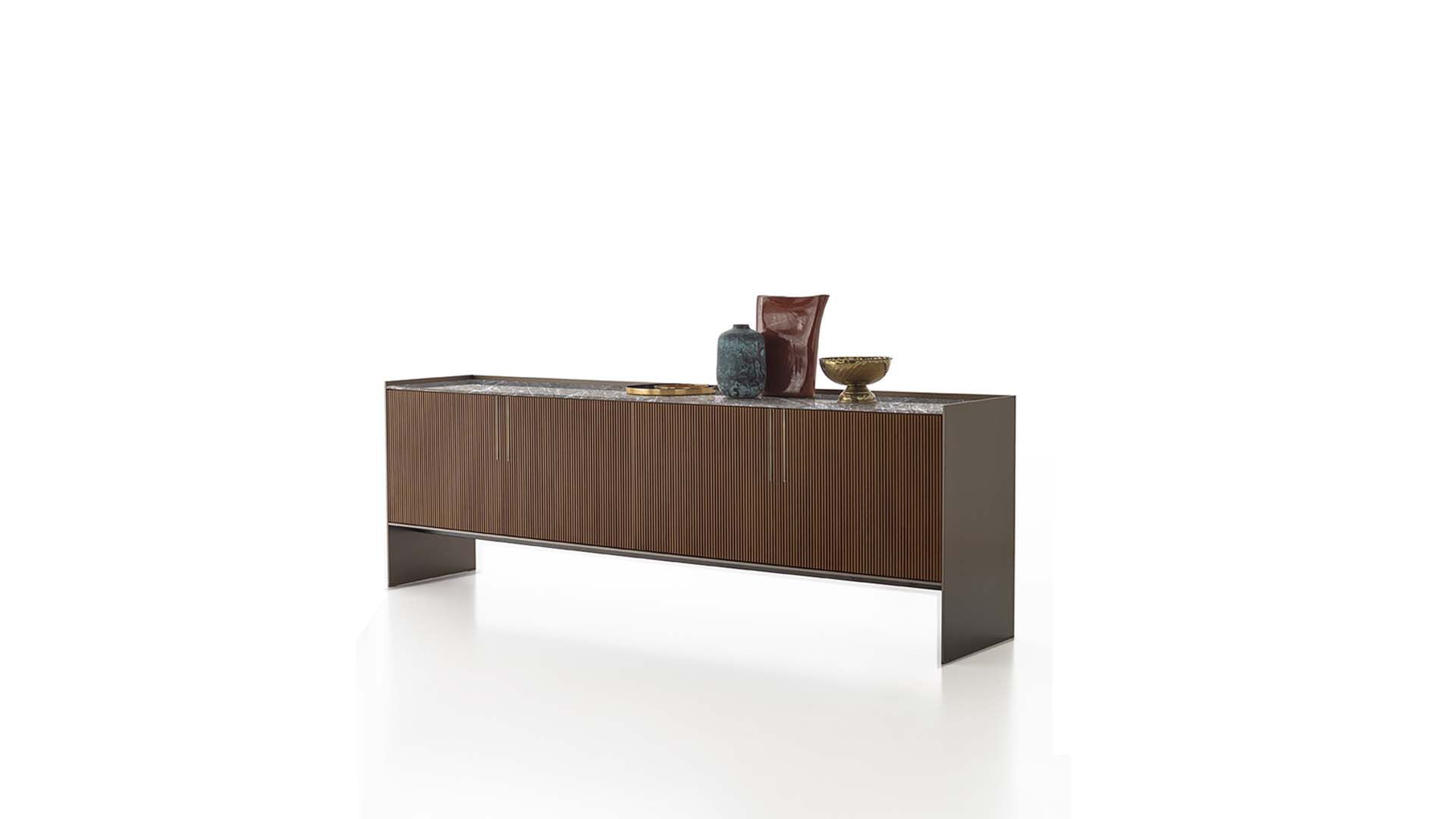 Комод с четырьмя дверцами, с боковинами из алюминия в титановой или бронзовой отделке, с титановыми или бронзовыми лакированными ручками из алюминия. Мраморная или керамическая столешница толщиной 5 мм, есть вариант со столешницей из прозрачного стекла. Фасад выполнен из ореха cannete, внутренняя отделка из матового лакированного МДФ ( цвет темно-красный 40.20 или песочный 15.65 ). Четыре внутренние полки в той же отделке. Дверки с возвратным механизмом. Задник в той же отделке, что и внутренняя часть комода.