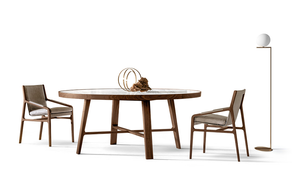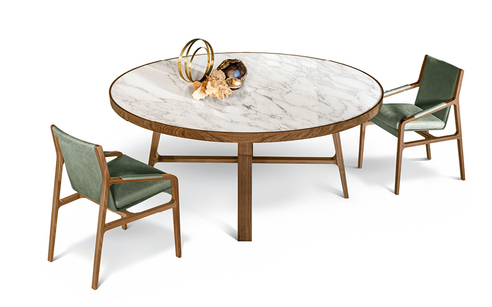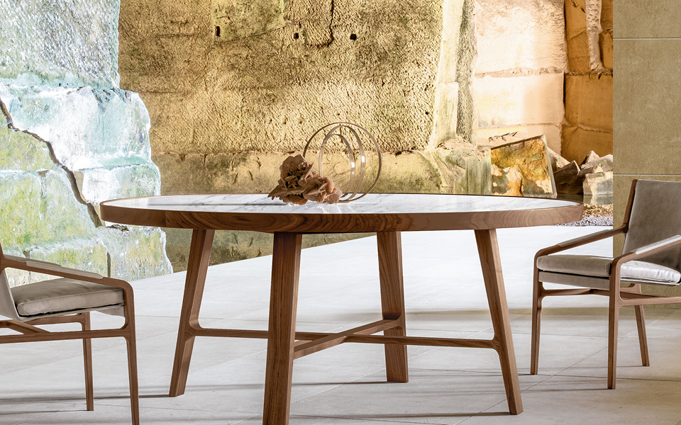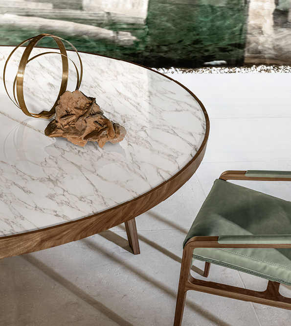 Натуральное дерево органично подчеркивает красоту мрамора и идеальную круглую форму стола Compass. Стол без каких-либо углов или острых краев дает возможность иметь безопасное пространство вокруг.