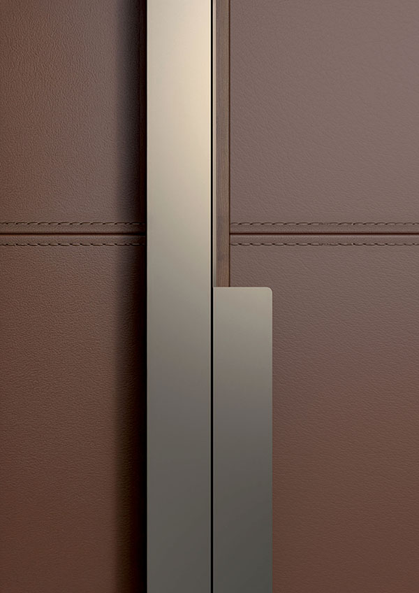 Фасады с рамой из массива ореха каналетто доступны в отделке с рифлением из ореха каналетто, в матовой лакировке или обтянуты кожей, украшенной строчкой в тон. Дверцы могут иметь систему открывания push-pull или декоративную ручку из окрашенного металла.