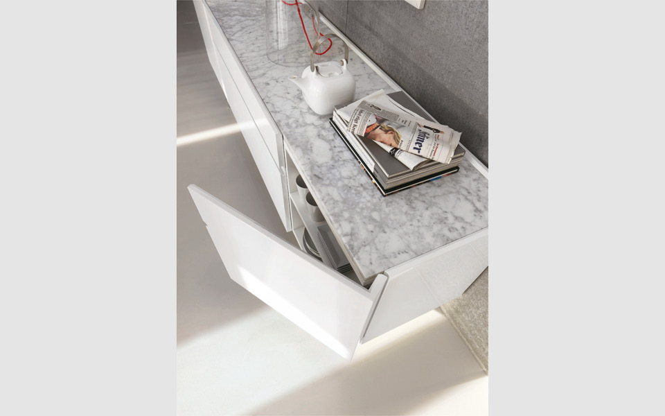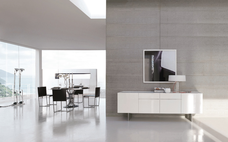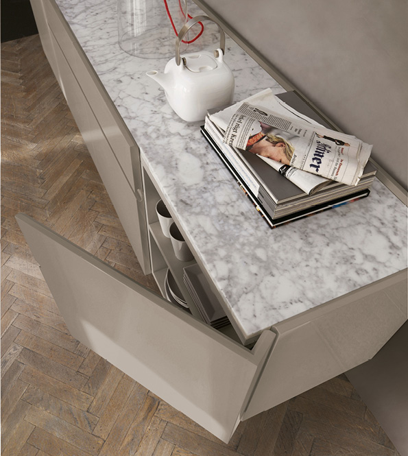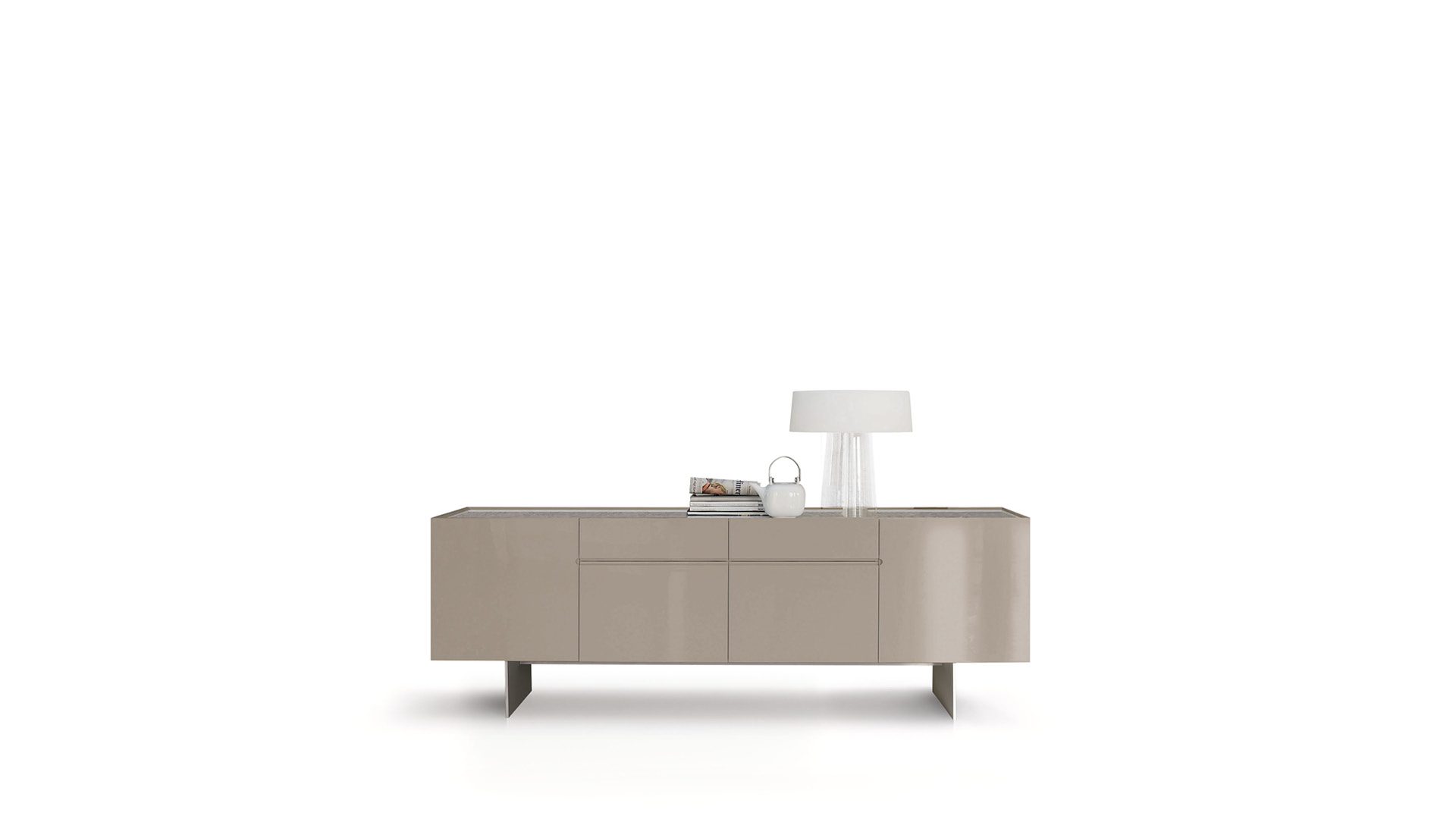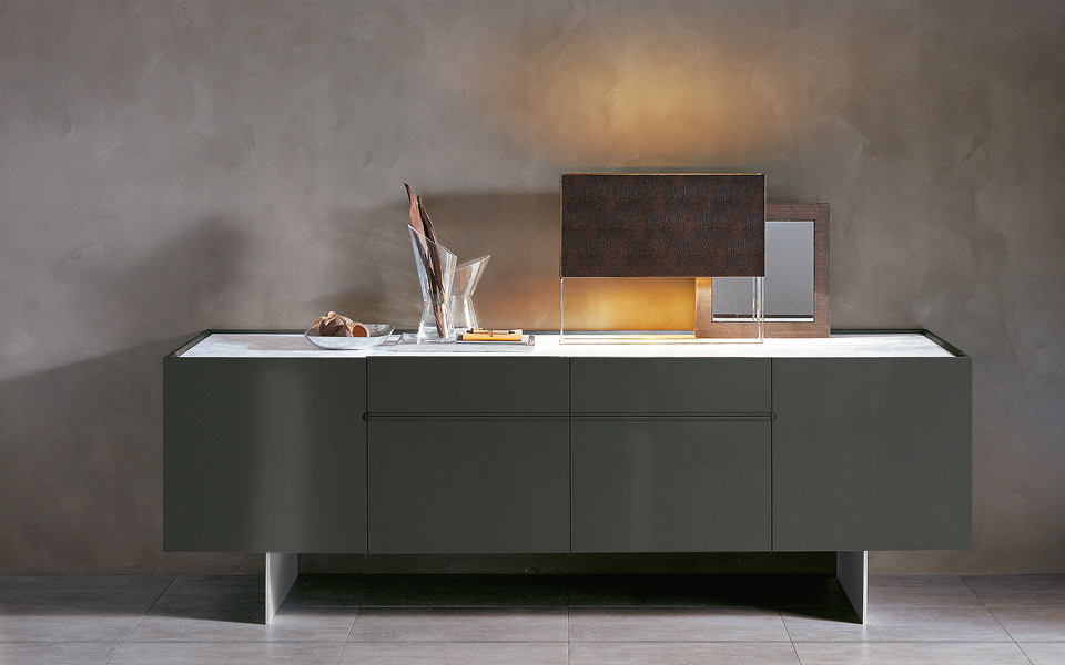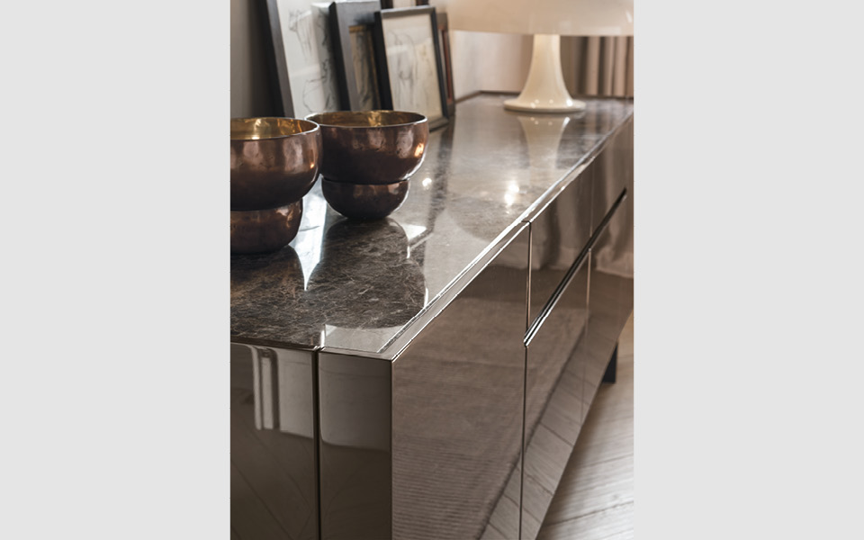 Комод из крашеного МДФ с 4 ящиками и двумя боковыми дверками. Столешница в мраморе или камне Pietra Serena. Необработанна или крашеная база из алюминия.