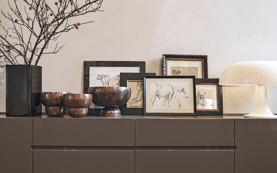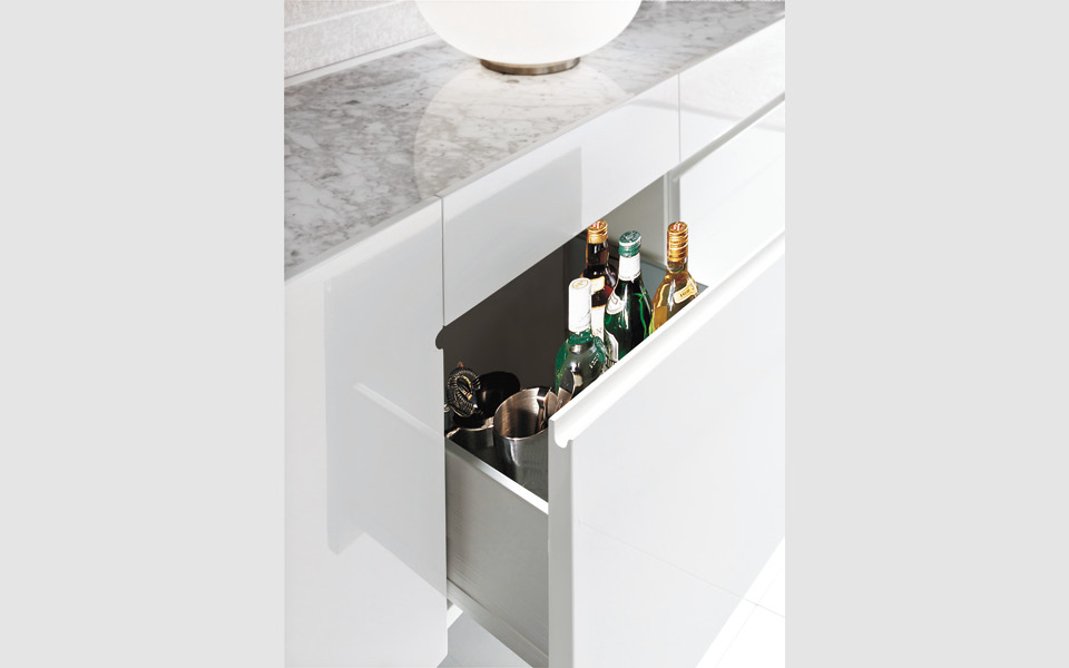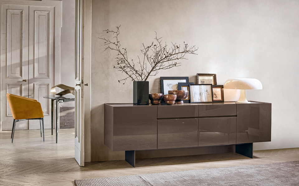 Высокий дизайн. Очень вместительный, с двумя боковыми дверками и 4 центральными ящиками. Красивый и вместе с тем функциональный. Утопленные ручки создают ощущение единой фронтальной поверхности, покрытой лаком.