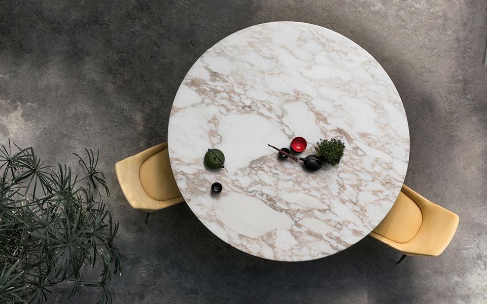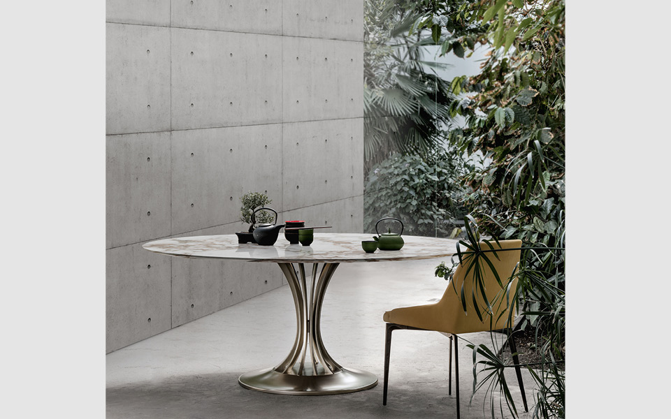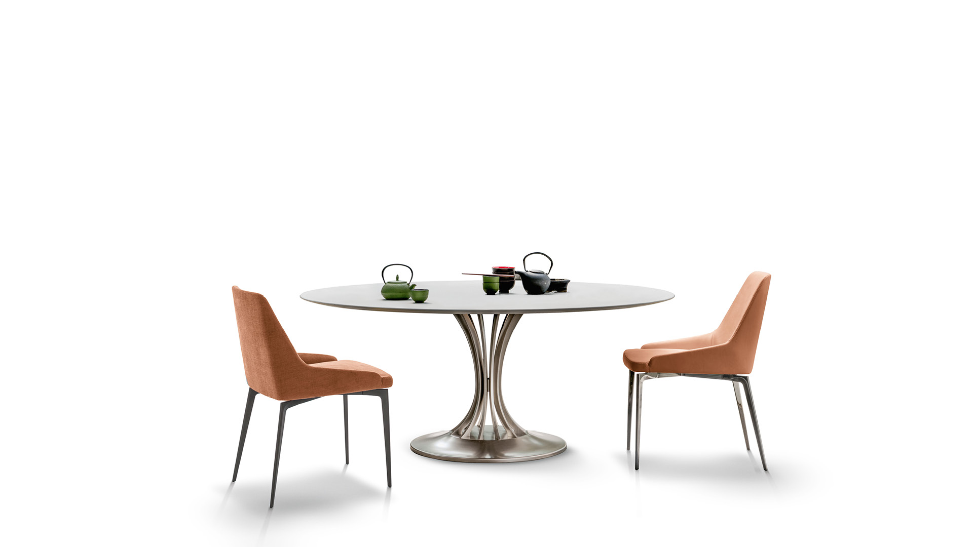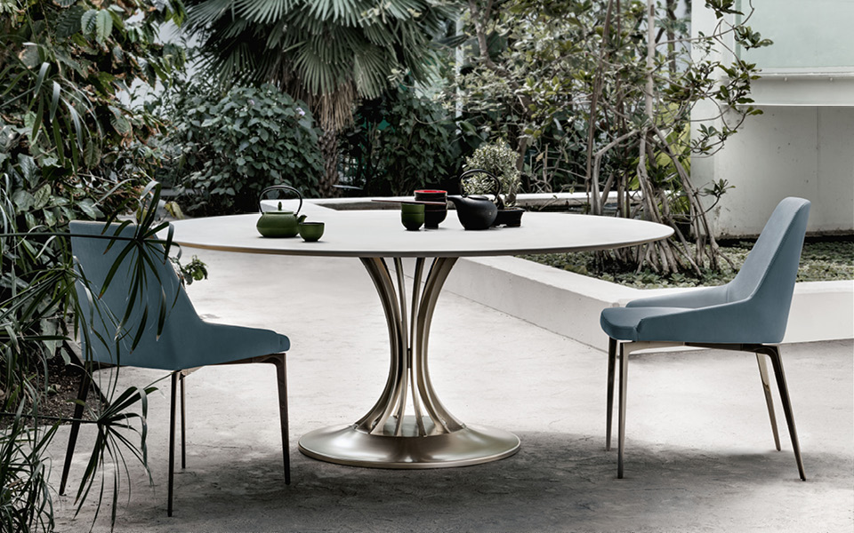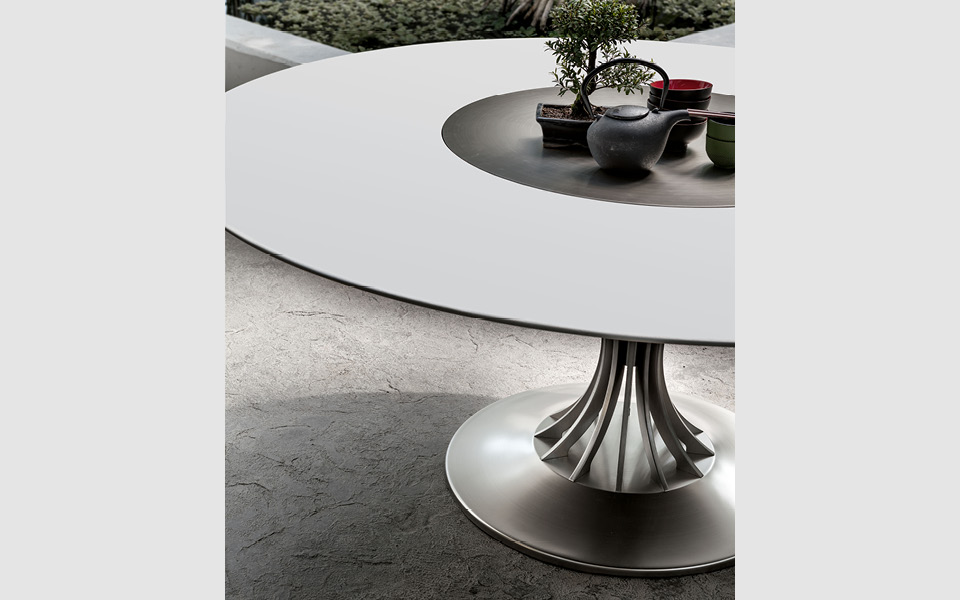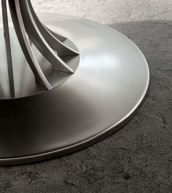 База в белом или черном цвете, а также в отделках champagne, bronze или peltrox. Ножка из хромированных или окрашенных стальных реек, вырезанных лазером. Столешница в мраморе, крашеном дубе или МДФ.