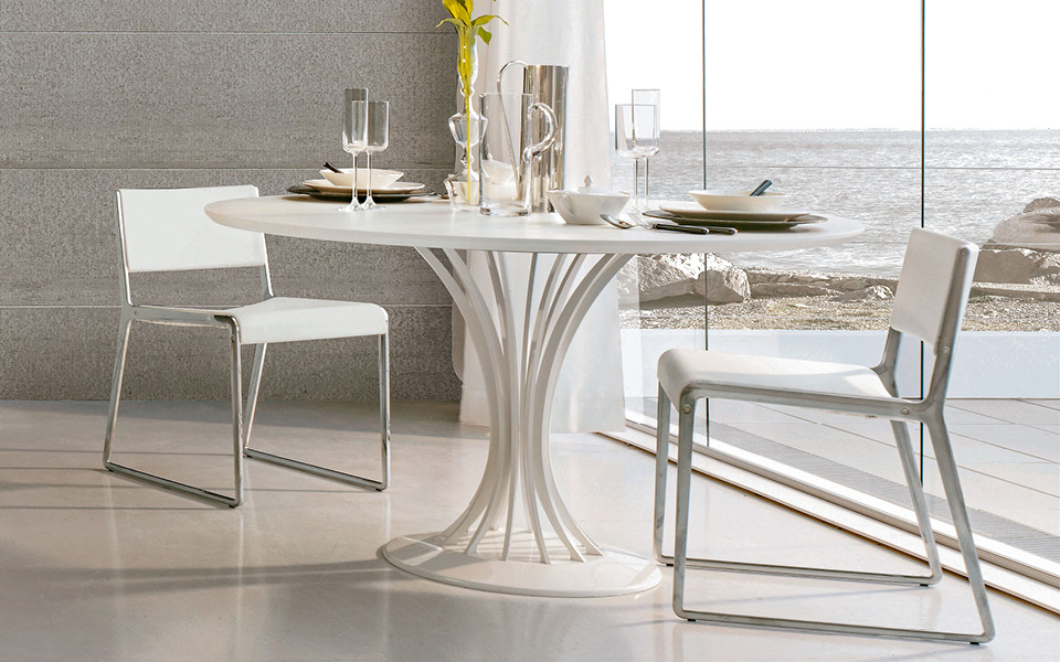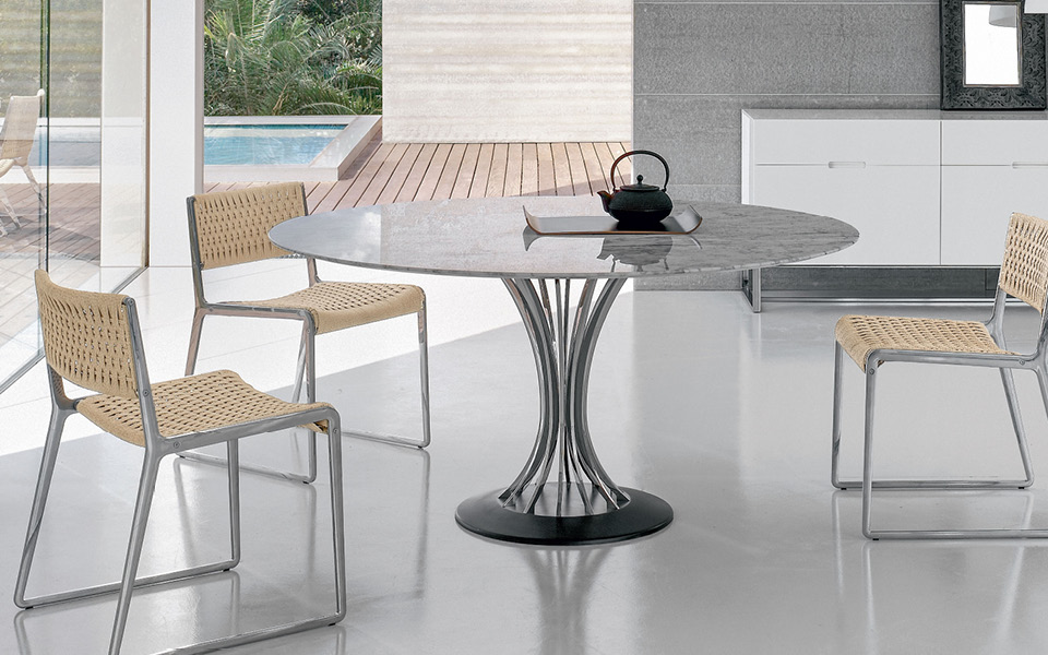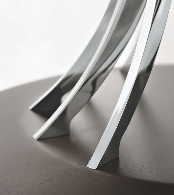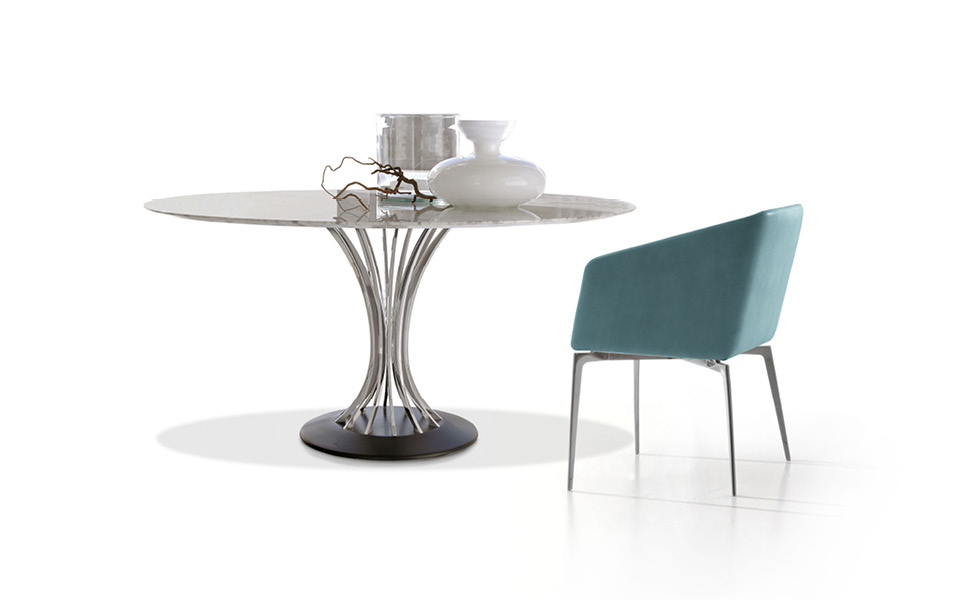 База в белом или черном цвете, а также в отделках champagne, bronze или peltrox. Ножка из хромированных или окрашенных стальных реек, вырезанных лазером. Столешница в мраморе, крашеном дубе или МДФ.