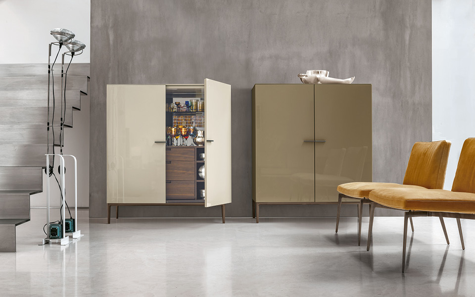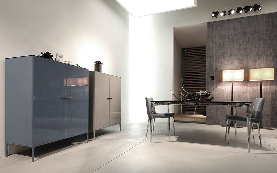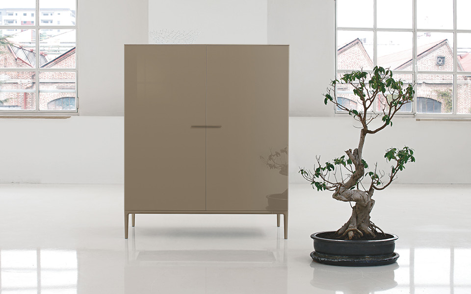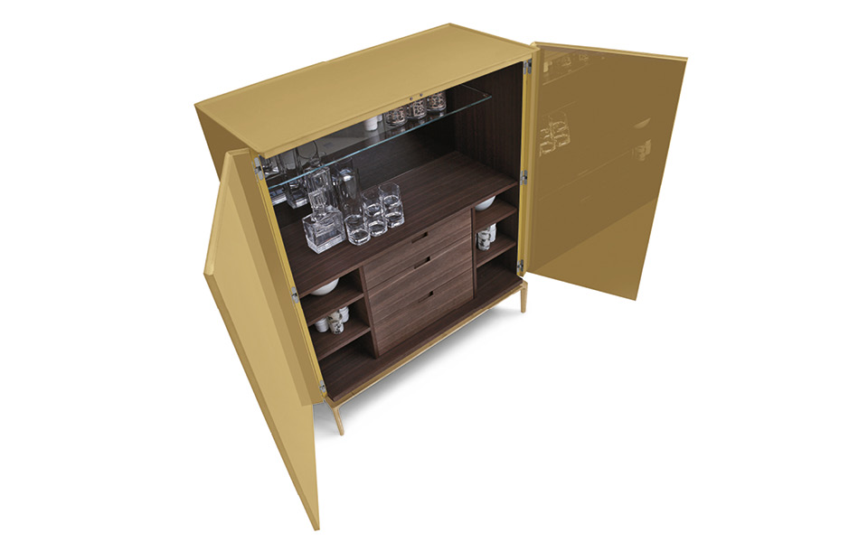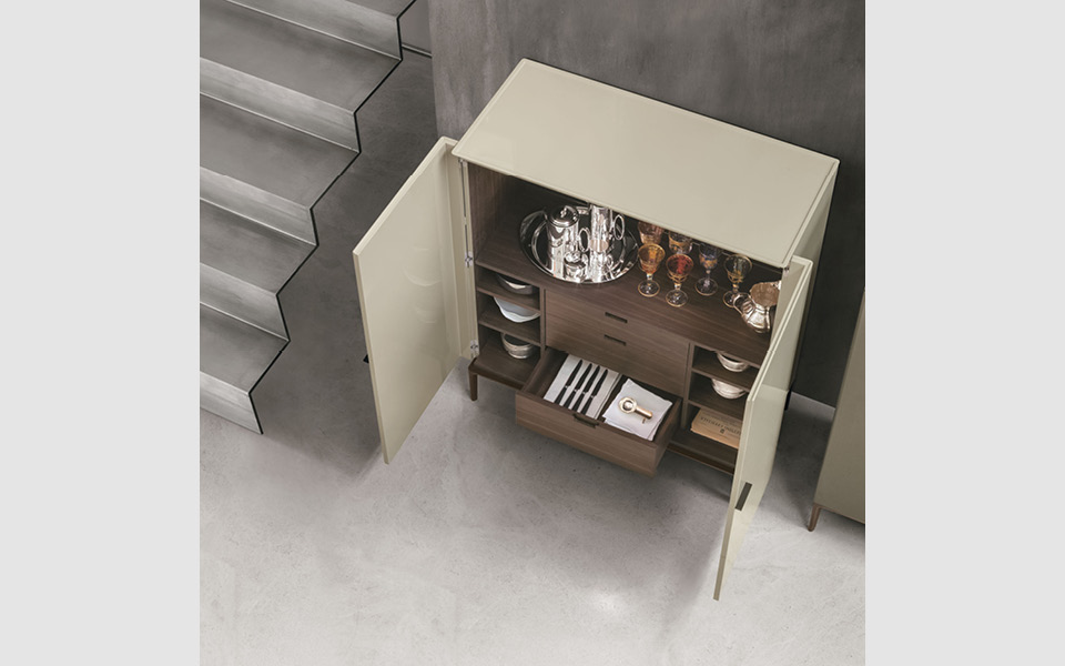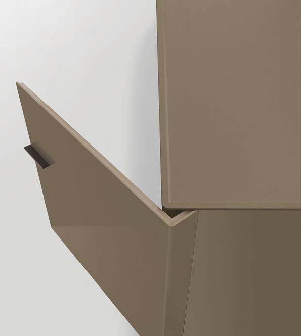 Комод из крашеного МДФ. База и ручки из полированного или крашеного алюминия. Внутреннее наполнение: зеркало, полки и три ящичка в отделке из термически обработанного дуба или ореха. Столешница из крашеного акрилового камня. Светодиодная подсветка по запросу.